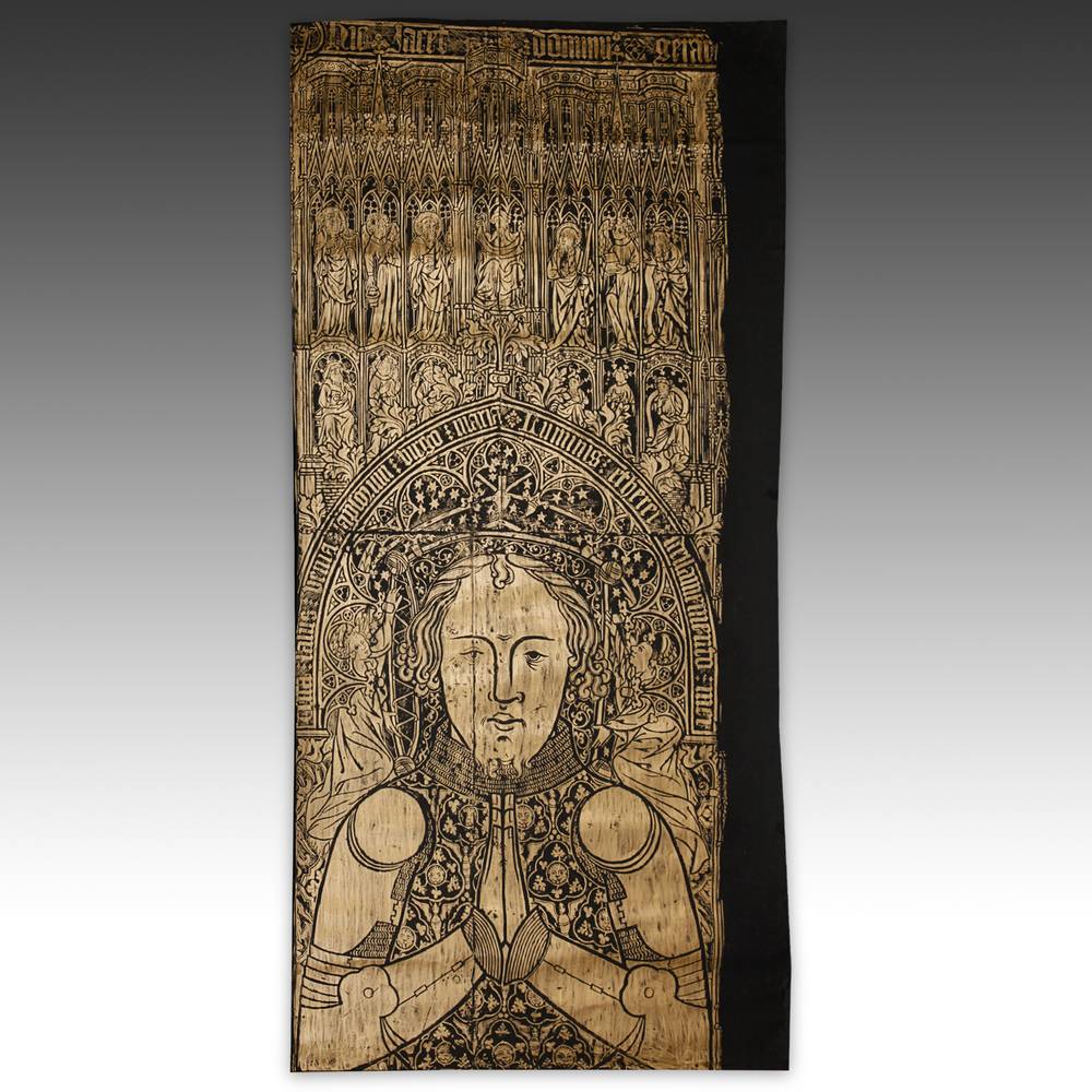 Brass rubbings are reproductions of engraved commemorative plaques, created by placing paper over the plate and rubbing with crayon or chalk. These rubbings were created by Jean Farrell in the 1960s and feature Belgian memorial stones dating from the 14th and 15th centuries. They went on to many private collections as well as museums.