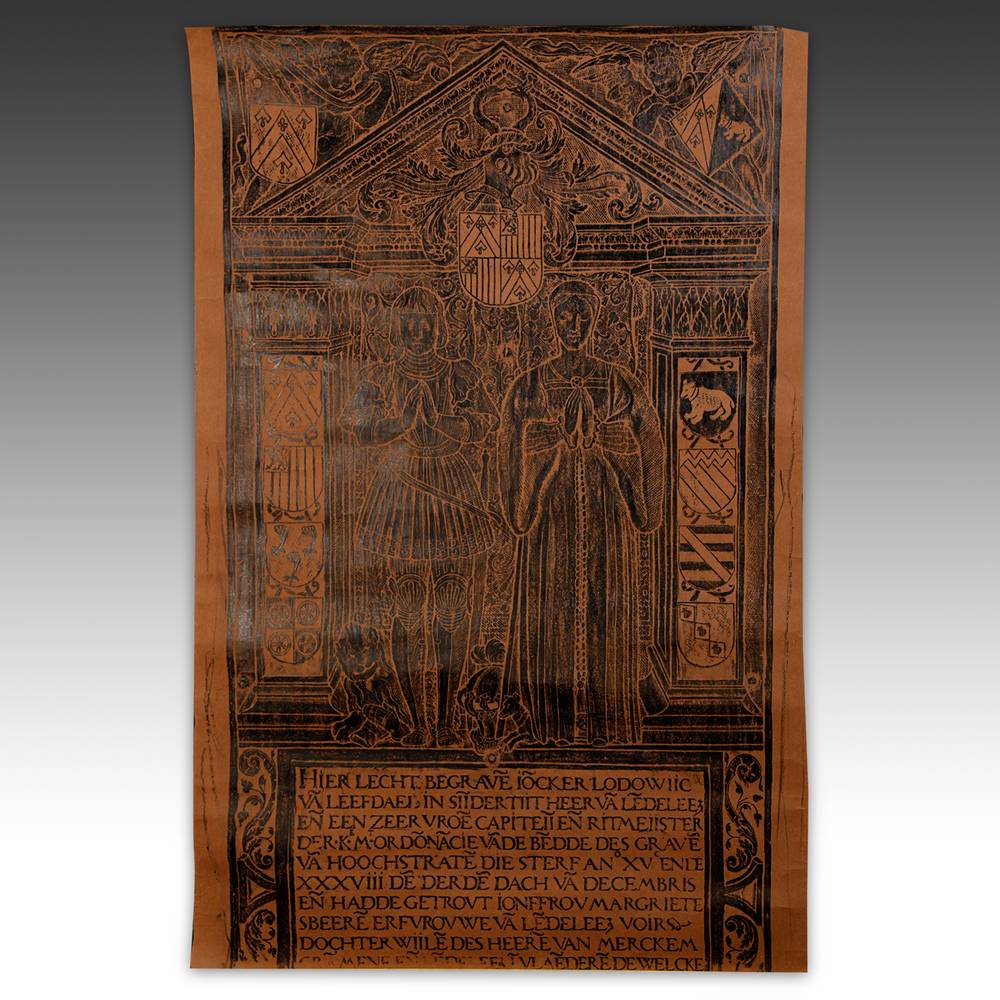 Brass rubbings are reproductions of engraved commemorative plaques, created by placing paper over the plate and rubbing with crayon or chalk. These rubbings were created by Jean Farrell in the 1960s and feature Belgian memorial stones dating from the 14th and 15th centuries. They went on to many private collections as well as museums.