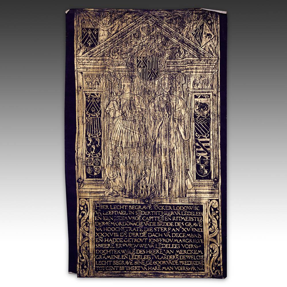 Brass rubbings are reproductions of engraved commemorative plaques, created by placing paper over the plate and rubbing with crayon or chalk. These rubbings were created by Jean Farrell in the 1960s and feature Belgian memorial stones dating from the 14th and 15th centuries. They went on to many private collections as well as museums.