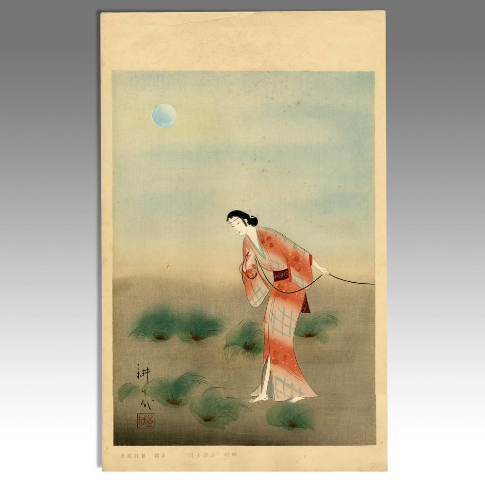 These prints are part of a series known as "Supplements of the Complete Works of Chikamatsu Monzaemon" produced between 1922 and 1926. Each print illustrates a scene or character from the famous works of Monzaemon (1623-1724), who was considered one of the greatest drama writers in Japanese history. Many well known artists collaborated on the series, including Kitano Tsunetomi, Ishikawa Toraji, Yamamura Toyonari, and Kaburagi Kiyokata. Important female painters of the period, Shima Seien and Uemura Shoen, also contributed designs.