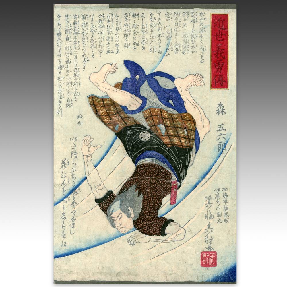 Utagawa Yoshitsuya (1822-1866), also known as Koko Yoshitsuya and Ichieisai Yoshitsuya was a student of Kuniyoshi and, like his master, is best known for his depictions of warriors. This series called "Kinsei Giyu Den" (Loyal Heroes of Recent Times) illustrates samurai warriors involved in the Sakuradamon Incident, one of the major events that triggered the collapse of the Tokugawa rule.