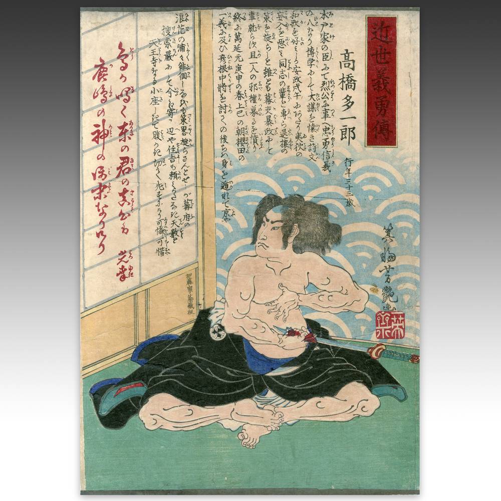 Utagawa Yoshitsuya (1822-1866), also known as Koko Yoshitsuya and Ichieisai Yoshitsuya was a student of Kuniyoshi and, like his master, is best known for his depictions of warriors. This series called "Kinsei Giyu Den" (Loyal Heroes of Recent Times) illustrates samurai warriors involved in the Sakuradamon Incident, one of the major events that triggered the collapse of the Tokugawa rule.