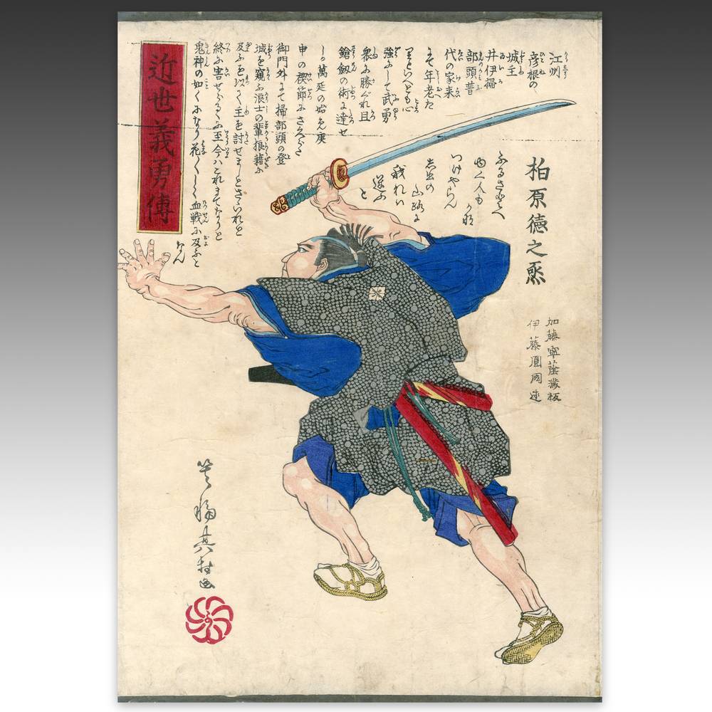 Utagawa Yoshitsuya (1822-1866), also known as Koko Yoshitsuya and Ichieisai Yoshitsuya was a student of Kuniyoshi and, like his master, is best known for his depictions of warriors. This series called "Kinsei Giyu Den" (Loyal Heroes of Recent Times) illustrates samurai warriors involved in the Sakuradamon Incident, one of the major events that triggered the collapse of the Tokugawa rule.