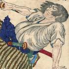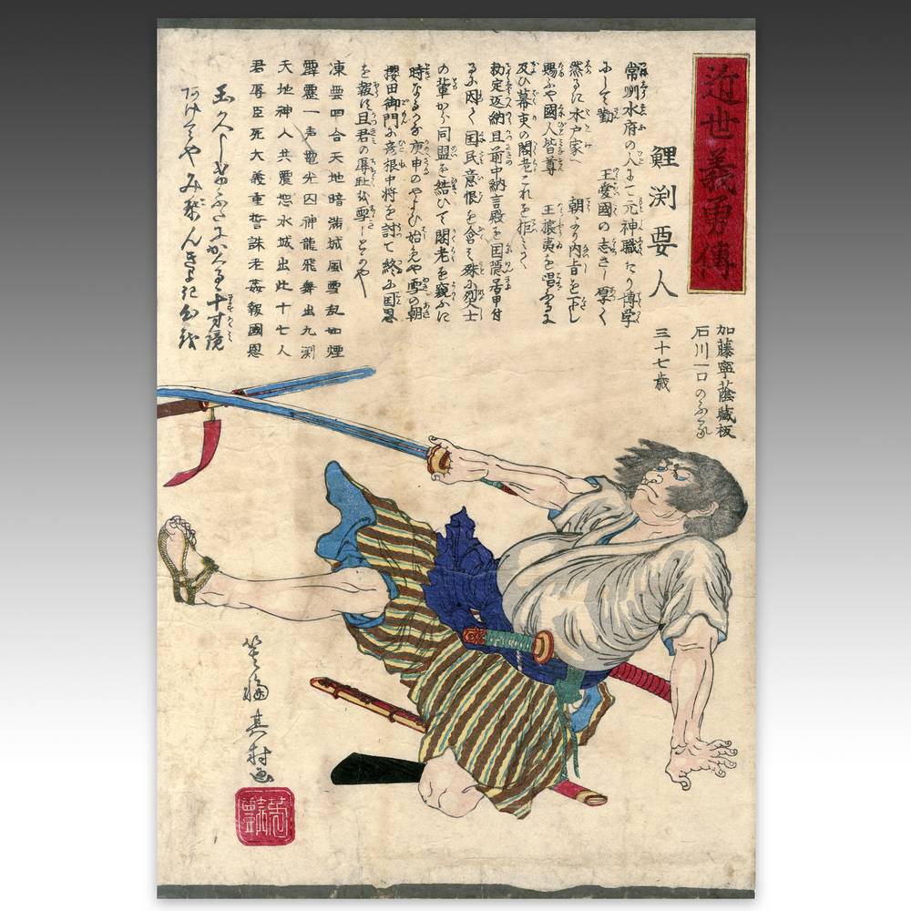 Utagawa Yoshitsuya (1822-1866), also known as Koko Yoshitsuya and Ichieisai Yoshitsuya was a student of Kuniyoshi and, like his master, is best known for his depictions of warriors. This series called "Kinsei Giyu Den" (Loyal Heroes of Recent Times) illustrates samurai warriors involved in the Sakuradamon Incident, one of the major events that triggered the collapse of the Tokugawa rule.