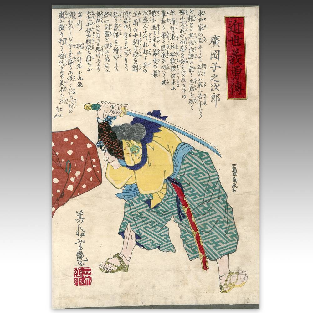 Utagawa Yoshitsuya (1822-1866), also known as Koko Yoshitsuya and Ichieisai Yoshitsuya was a student of Kuniyoshi and, like his master, is best known for his depictions of warriors. This series called "Kinsei Giyu Den" (Loyal Heroes of Recent Times) illustrates samurai warriors involved in the Sakuradamon Incident, one of the major events that triggered the collapse of the Tokugawa rule.
