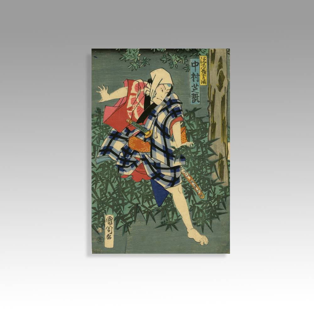 Toyohara Kunichika (1835-1900) was one of the last great Ukiyo-e masters of Japan. He was apprenticed to Utagawa Kunisada and quickly became one of his most talented students, repeatedly ranked among the top ten ukiyo-e artists in Japan. His interest in Kabuki led to him become a master of theatrical prints and his bust portraits of actors are well known. His triptychs depicting scenes from kabuki plays are some of the most dramatic ever produced. Other subjects of his prints included bijin-ga beauties, historical scenes and the contemporary social life of the rapidly-modernizing Meiji period.