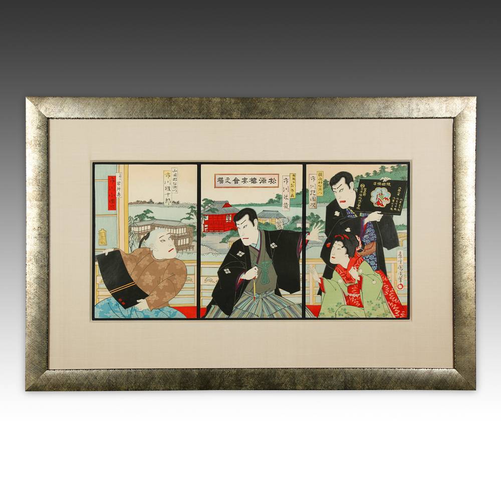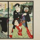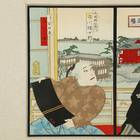 Toyohara Kunichika (1835-1900) was one of the last great Ukiyo-e masters of Japan. He was apprenticed to Utagawa Kunisada and quickly became one of his most talented students, repeatedly ranked among the top ten ukiyo-e artists in Japan. His interest in Kabuki led to him become a master of theatrical prints and his bust portraits of actors are well known. His triptychs depicting scenes from kabuki plays are some of the most dramatic ever produced. Other subjects of his prints included bijin-ga beauties, historical scenes and the contemporary social life of the rapidly-modernizing Meiji period.
