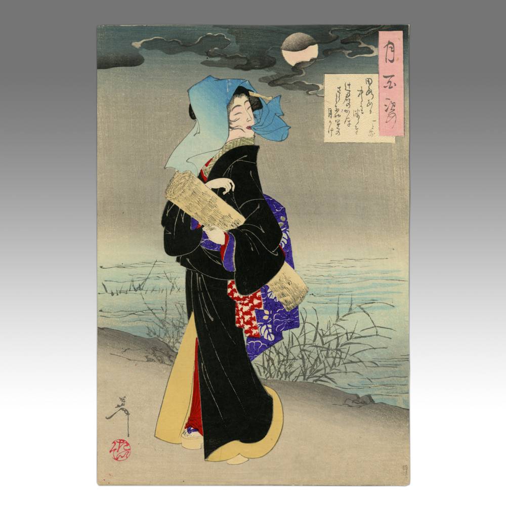 Tsukioka Yoshitoshi (1839-1892) is widely recognized as the last great master of Ukiyo-e and one of the form's greatest innovators. Living the last years of feudal Japan and the first years of modern Japan following the Meiji Restoration, Yoshitoshi was as equally interested in new things as concerned with the loss of traditional Japanese culture. One of his greatest works was this series, One Hundred Aspects of the Moon, depicting scenes from Japanese and Chinese history and legend, with the moon as the unifying element.