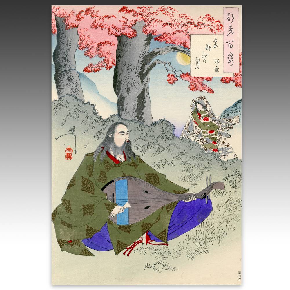 Tsukioka Yoshitoshi (1839-1892) is widely recognized as the last great master of Ukiyo-e and one of the form's greatest innovators. Living the last years of feudal Japan and the first years of modern Japan following the Meiji Restoration, Yoshitoshi was as equally interested in new things as concerned with the loss of traditional Japanese culture. One of his greatest works was this series, One Hundred Aspects of the Moon, depicting scenes from Japanese and Chinese history and legend, with the moon as the unifying element.