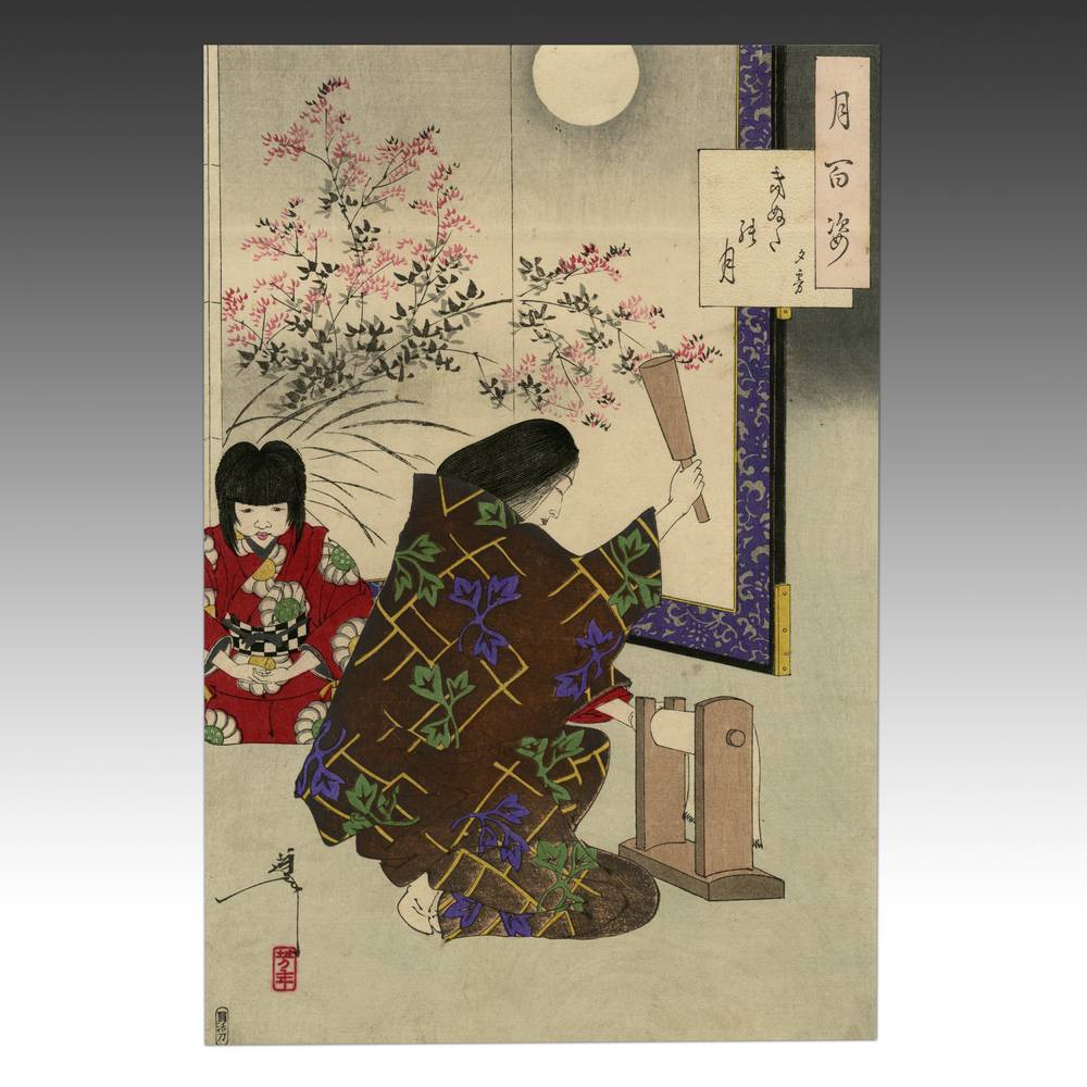 Tsukioka Yoshitoshi (1839-1892) is widely recognized as the last great master of Ukiyo-e and one of the form's greatest innovators. Living the last years of feudal Japan and the first years of modern Japan following the Meiji Restoration, Yoshitoshi was as equally interested in new things as concerned with the loss of traditional Japanese culture. One of his greatest works was this series, One Hundred Aspects of the Moon, depicting scenes from Japanese and Chinese history and legend, with the moon as the unifying element.
