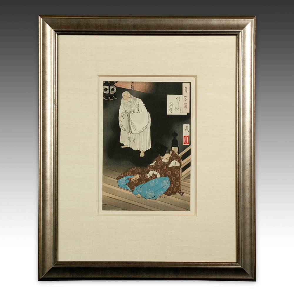 Tsukioka Yoshitoshi (1839-1892) is widely recognized as the last great master of Ukiyo-e and one of the form's greatest innovators. Living the last years of feudal Japan and the first years of modern Japan following the Meiji Restoration, Yoshitoshi was as equally interested in new things as concerned with the loss of traditional Japanese culture. One of his greatest works was this series, One Hundred Aspects of the Moon, depicting scenes from Japanese and Chinese history and legend, with the moon as the unifying element.