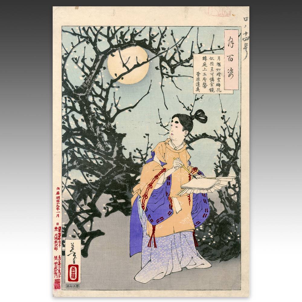 Tsukioka Yoshitoshi (1839-1892) is widely recognized as the last great master of Ukiyo-e and one of the form's greatest innovators. Living the last years of feudal Japan and the first years of modern Japan following the Meiji Restoration, Yoshitoshi was as equally interested in new things as concerned with the loss of traditional Japanese culture. One of his greatest works was this series, One Hundred Aspects of the Moon, depicting scenes from Japanese and Chinese history and legend, with the moon as the unifying element.