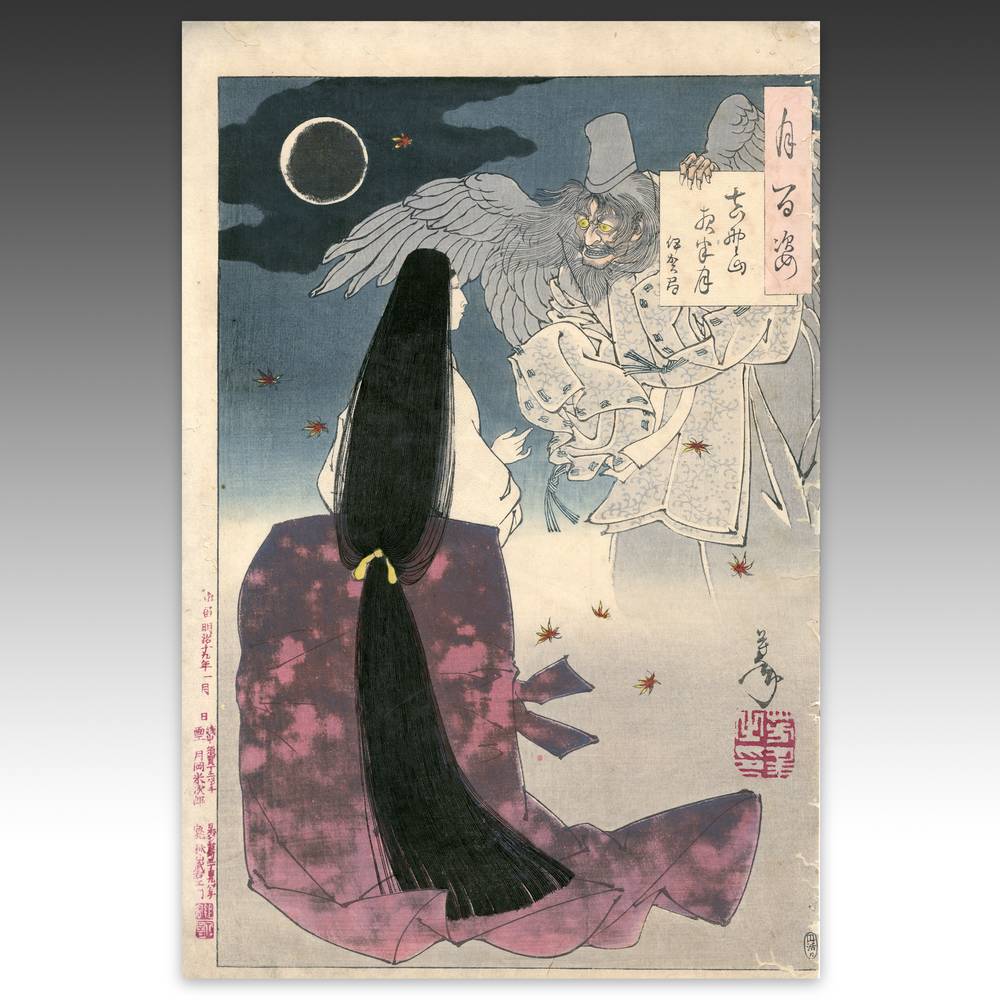 Tsukioka Yoshitoshi (1839-1892) is widely recognized as the last great master of Ukiyo-e and one of the form's greatest innovators. Living the last years of feudal Japan and the first years of modern Japan following the Meiji Restoration, Yoshitoshi was as equally interested in new things as concerned with the loss of traditional Japanese culture. One of his greatest works was this series, One Hundred Aspects of the Moon, depicting scenes from Japanese and Chinese history and legend, with the moon as the unifying element.
