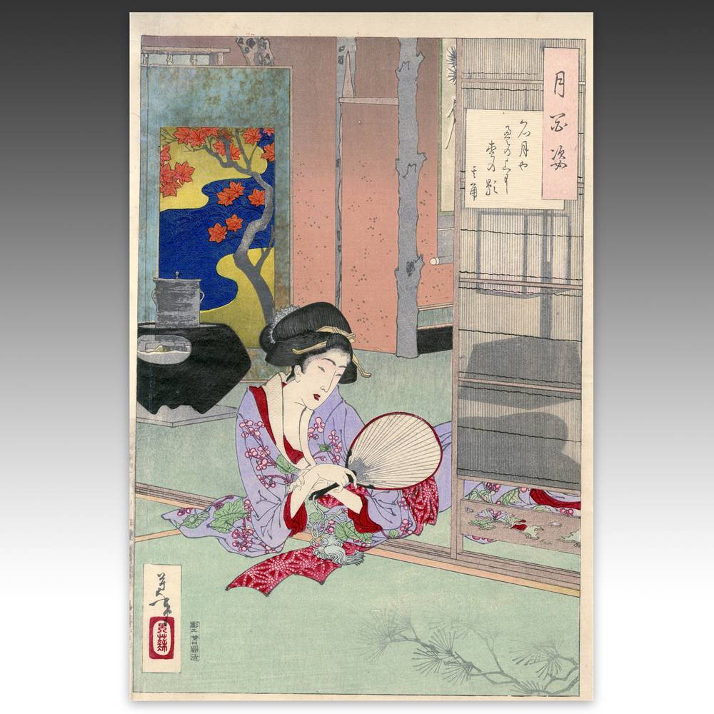 Tsukioka Yoshitoshi (1839-1892) is widely recognized as the last great master of Ukiyo-e and one of the form's greatest innovators. Living the last years of feudal Japan and the first years of modern Japan following the Meiji Restoration, Yoshitoshi was as equally interested in new things as concerned with the loss of traditional Japanese culture. One of his greatest works was this series, One Hundred Aspects of the Moon, depicting scenes from Japanese and Chinese history and legend, with the moon as the unifying element.
