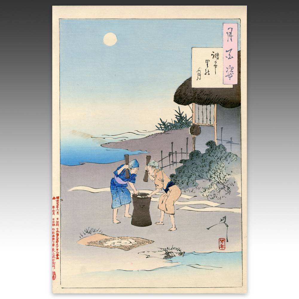 Tsukioka Yoshitoshi (1839-1892) is widely recognized as the last great master of Ukiyo-e and one of the form's greatest innovators. Living the last years of feudal Japan and the first years of modern Japan following the Meiji Restoration, Yoshitoshi was as equally interested in new things as concerned with the loss of traditional Japanese culture. One of his greatest works was this series, One Hundred Aspects of the Moon, depicting scenes from Japanese and Chinese history and legend, with the moon as the unifying element.
