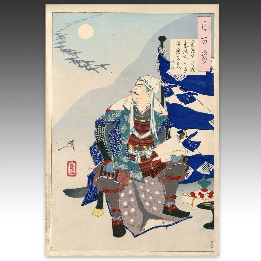 Tsukioka Yoshitoshi (1839-1892) is widely recognized as the last great master of Ukiyo-e and one of the form's greatest innovators. Living the last years of feudal Japan and the first years of modern Japan following the Meiji Restoration, Yoshitoshi was as equally interested in new things as concerned with the loss of traditional Japanese culture. One of his greatest works was this series, One Hundred Aspects of the Moon, depicting scenes from Japanese and Chinese history and legend, with the moon as the unifying element.