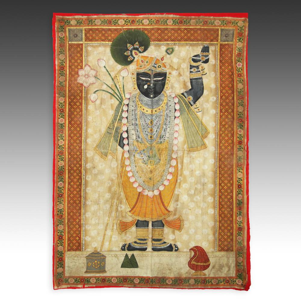 The pichvai (picha — back, and vai — of) is a hanging cloth displayed behind the statue of a deity. In the 15th century the cult of bhakti, or devotion, swept over India... <a href="/stories-descriptions/indian-pichvai-depicting-krishna">Read more</a>
