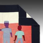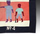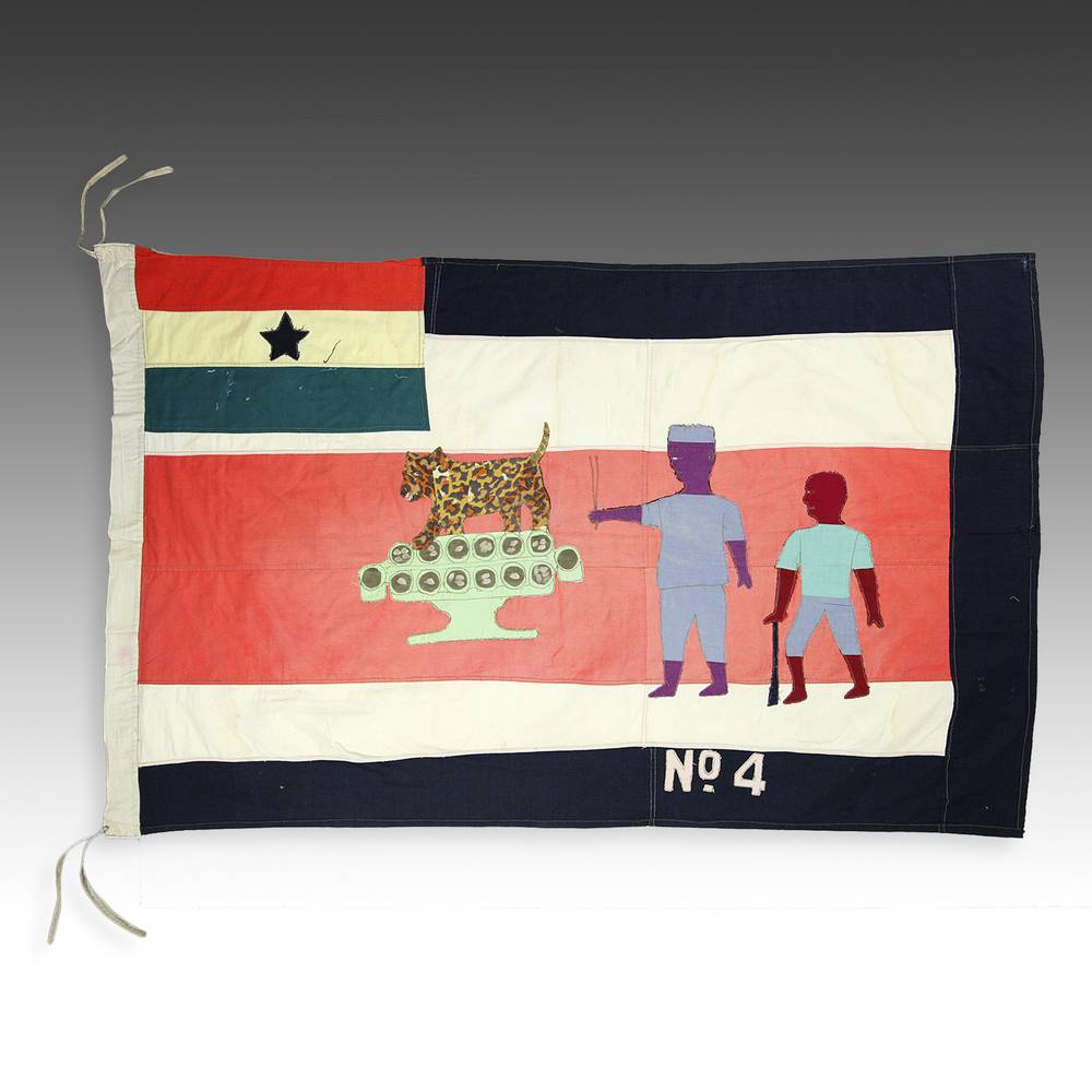 Even though the Akan societies in Ghana had no standing army, the asafo or people's militia, was a well established social and political organization based on military principles. Each asafo group is identified by a particular name and number and through a set of symbols displayed prominently on its flag. Verbal proverbs, a significant facet of Akan culture, are represented by colored cutout figures appliqued on the cotton ground.