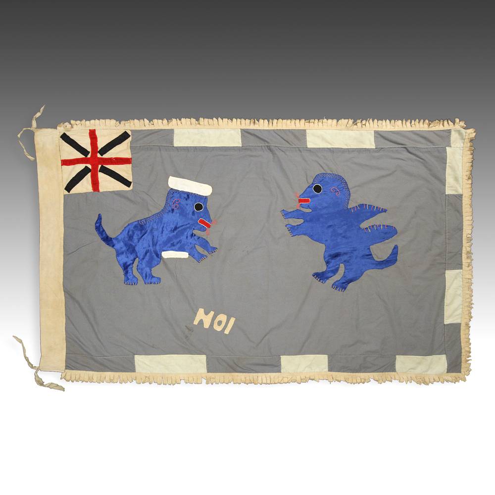 Even though the Akan societies in Ghana had no standing army, the asafo or people's militia, was a well established social and political organization based on military principles. Each asafo group is identified by a particular name and number and through a set of symbols displayed prominently on its flag. Verbal proverbs, a significant facet of Akan culture, are represented by colored cutout figures appliqued on the cotton ground.