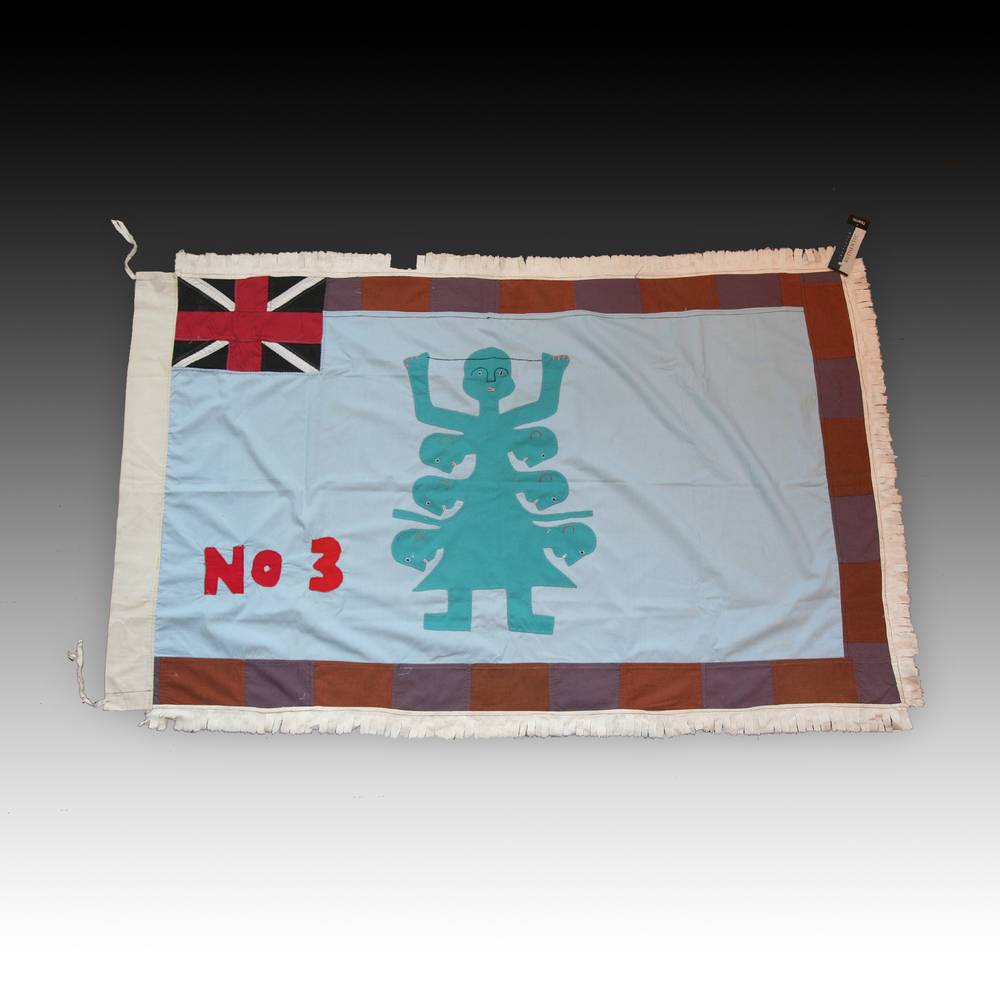 Even though the Akan societies in Ghana had no standing army, the asafo or people's militia, was a well established social and political organization based on military principles. Each asafo group is identified by a particular name and number and through a set of symbols displayed prominently on its flag. Verbal proverbs, a significant facet of Akan culture, are represented by colored cutout figures appliqued on the cotton ground.