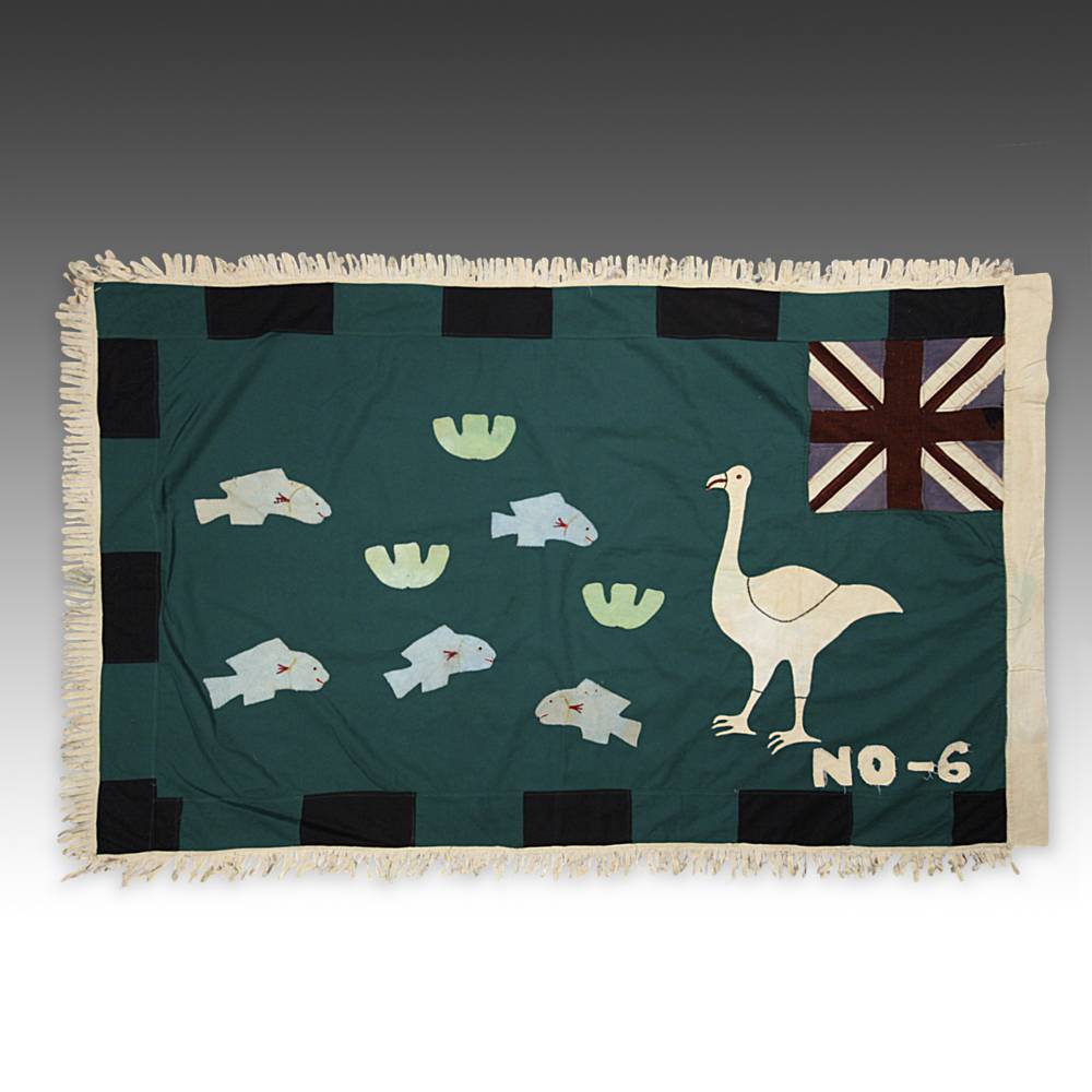 Even though the Akan societies in Ghana had no standing army, the asafo or people's militia, was a well established social and political organization based on military principles. Each asafo group is identified by a particular name and number and through a set of symbols displayed prominently on its flag. Verbal proverbs, a significant facet of Akan culture, are represented by colored cutout figures appliqued on the cotton ground.