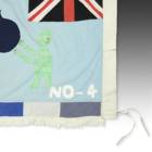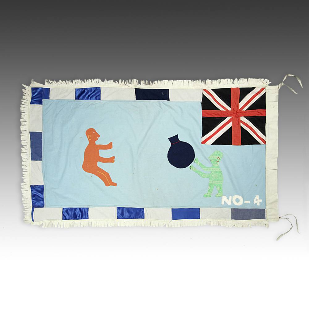Even though the Akan societies in Ghana had no standing army, the asafo or people's militia, was a well established social and political organization based on military principles. Each asafo group is identified by a particular name and number and through a set of symbols displayed prominently on its flag. Verbal proverbs, a significant facet of Akan culture, are represented by colored cutout figures appliqued on the cotton ground.