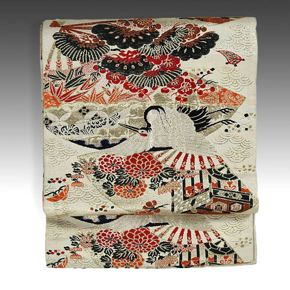 Maru Obi with Crane and Flowers in Fan-Shape Motif