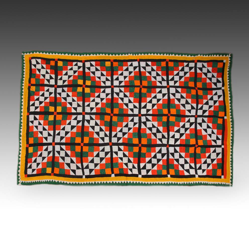 pieced and hand-quilted cotton and other fabrics