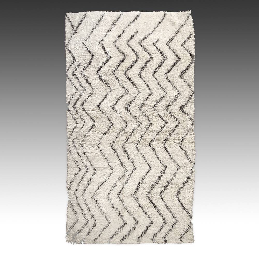 The Beni Ourain people, living in the Middle Atlas ranges of Morocco, weave one of the most unique carpets of the region. Due to their geographic isolation deep in the mountains, they were historically untouched by the influence of Arabic designs. The motifs found on Beni Ourain rugs are abstracted representations of the world and landscapes surrounding the people. Adhering to no rule or formal pattern, the designs on these large, plush rugs have a freshness and spontaneity found no place else.